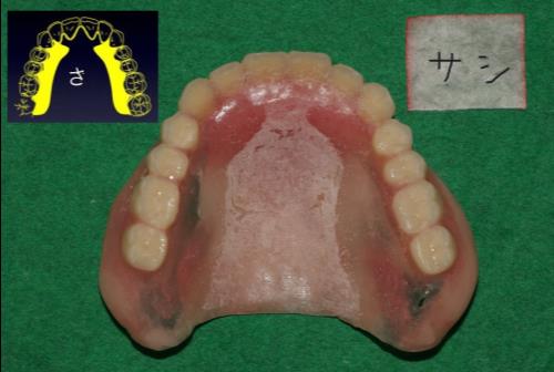 印象材の粉を口蓋につけて「サ行」を発音してもらい、舌の触れ具合を確認。口蓋の後ろに厚みをつけて、「サ行」の発音も上手くできるようになりました。