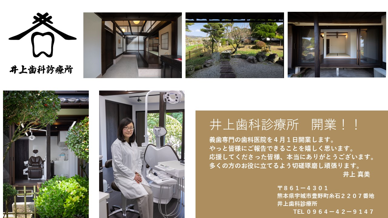 2023/04/01 御開院「井上歯科診療所」14年間当院に勤務して下さいました井上真美先生が熊本市でご開業されました!古民家風の義歯専門歯科医院です。素敵なお庭に心癒されながら、歯科治療が受けられます。今後のご発展を心よりお祈り致します。
